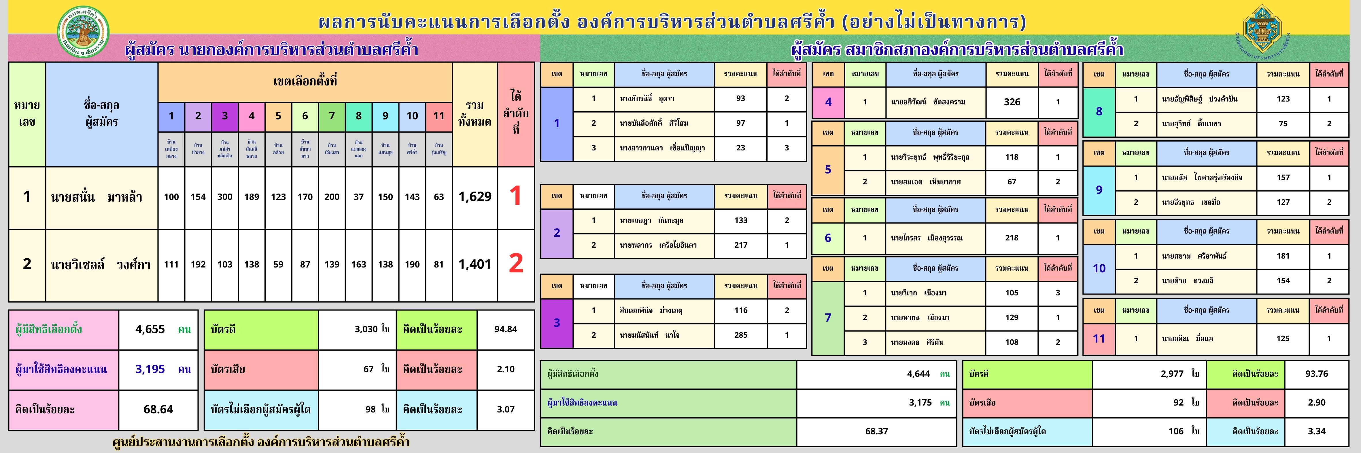 องค์การบริหารส่วนตำบลศรีค้ำ ขอแจ้งผลการนับคะแนนการเลือกตั้ง ซึ่งเป็น ผลการนับคะแนนอย่างไม่เป็นทางการ เพื่อประชาสัมพันธ์ให้ประชาชนทราบโดยทั่วกัน
