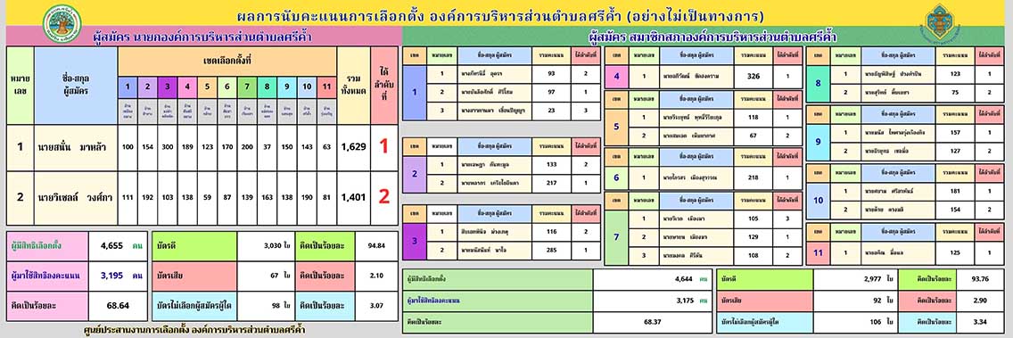 องค์การบริหารส่วนตำบลศรีค้ำ ขอแจ้งผลการนับคะแนนการเลือกตั้ง ซึ่งเป็น ผลการนับคะแนนอย่างไม่เป็นทางการ เพื่อประชาสัมพันธ์ให้ประชาชนทราบโดยทั่วกัน