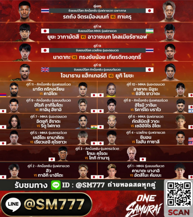 เว็บแทงมวย ที่น่าเชื่อถือในปี 2569 แทงมวย ONE ราคาเริ่มต้นเพียง 10 บาทต่อคู่ ระบบฝาก-ถอนออโต้ เว็บไซต์อันดับ 1 ที่มั่นคงบริการรวดเร็วทันใจ @SM777 ONE SAMURAI 1 | 29 เม.ย 2569  ดูสดพร้อมเดิมพันทุกคู่ !!